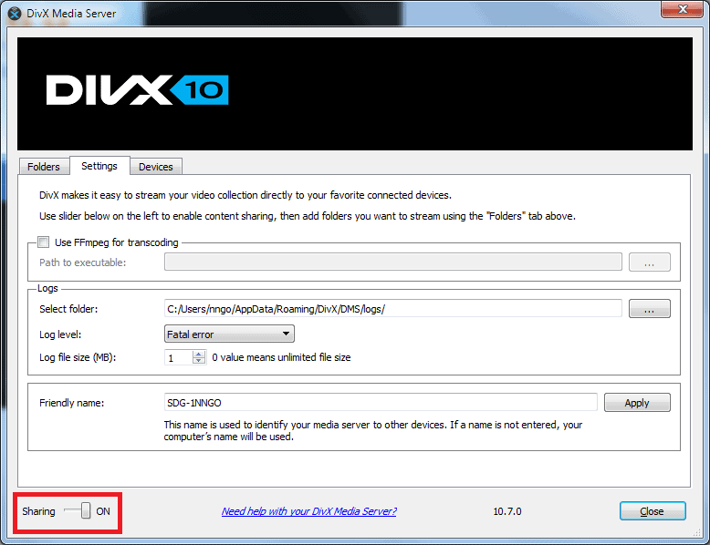 Cast from your computer: Using free DivX Software, open a video in DivX Player. Once you select the casting icon at the bottom right (and “Sharing” is turned on), you can pick a device to cast your video. Keep in mind that the smart TV or device (e.g. Chromecast, Roku, Xbox) must be on the same network. If you run into any challenges, please check out our Support site for more help with DivX Media Server.