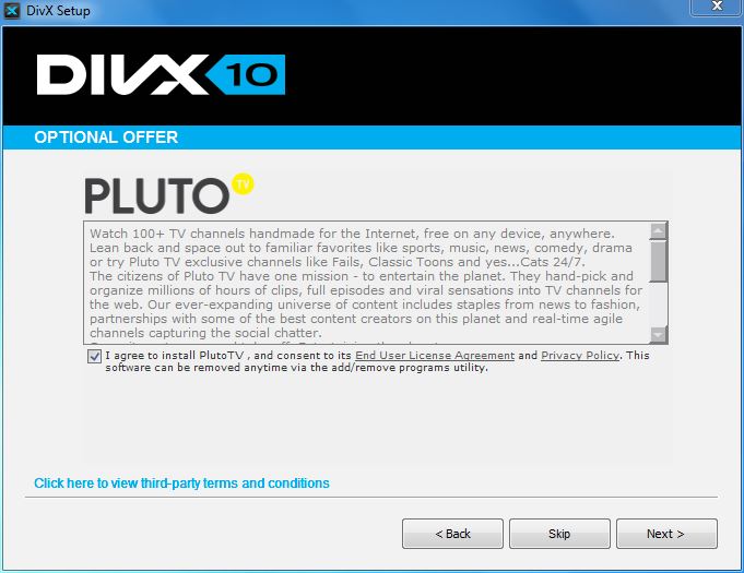 You’ve likely seen third-party offers before when installing software. Hopefully, the offer you see from DivX (like the one below) is one that’s of interest to you and improves your experience. If not, you can always choose to skip the offer. DivX Software will still be free and nothing will be installed without your permission.